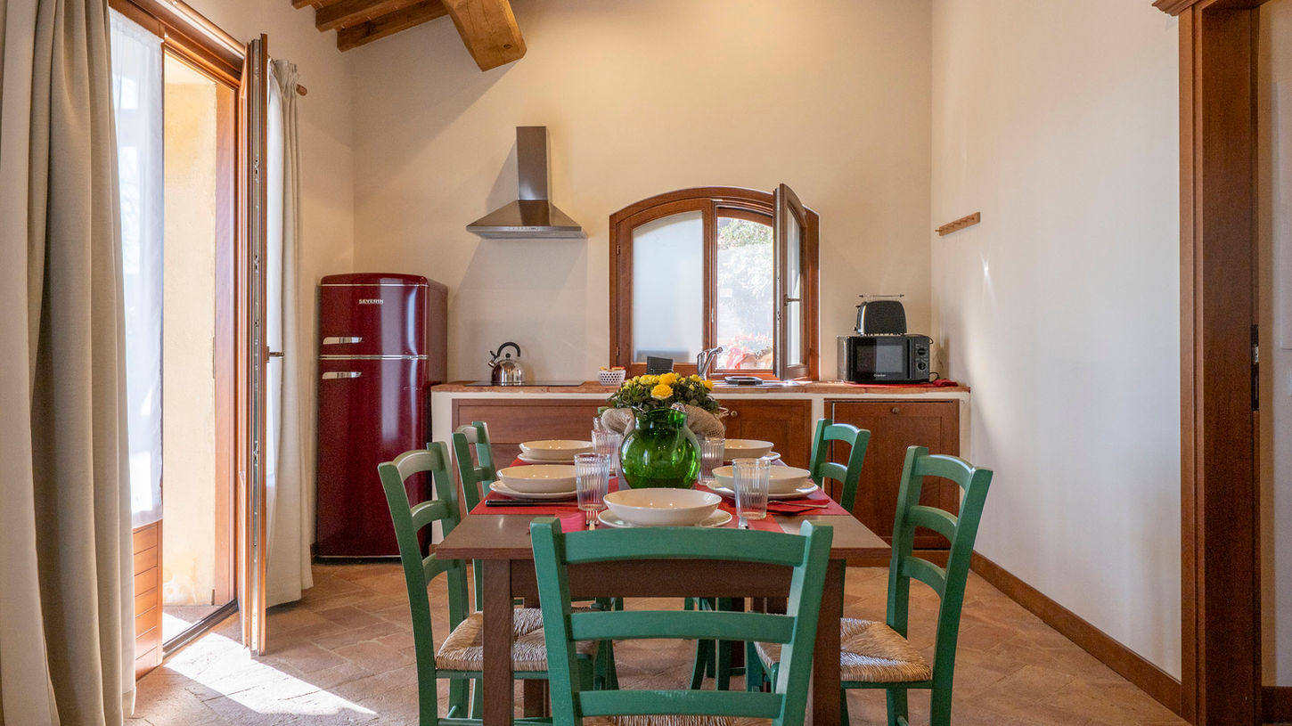 A fianco alla struttura principale, ma autonomo in tutte le sue dotazioni, il Poderino Casana è un ampio appartamento al piano terreno ideale per famiglie o piccoli gruppi, con portico privato di 38 m² e splendida vista sulle Crete Senesi e sulla Val d’Arbia.